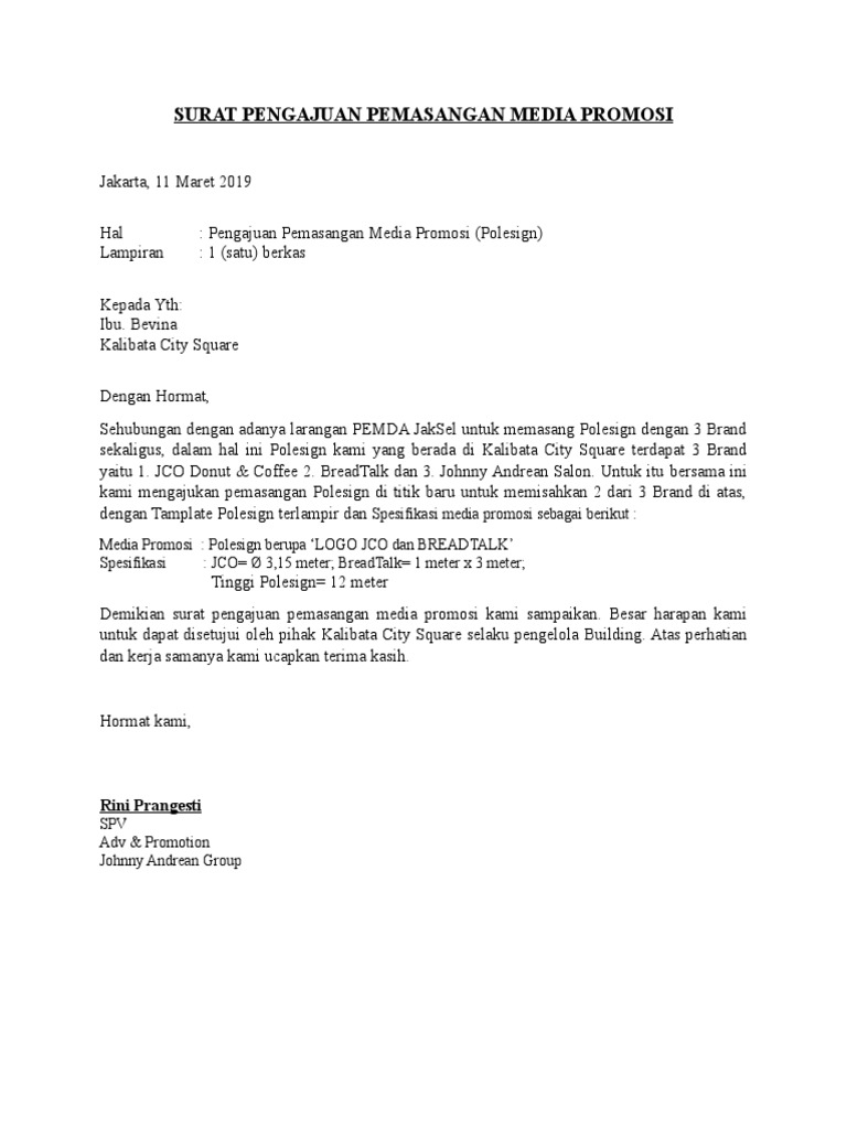 Surat Pengajuan Pemasangan Media Promosi Jco Foresta Pdf
